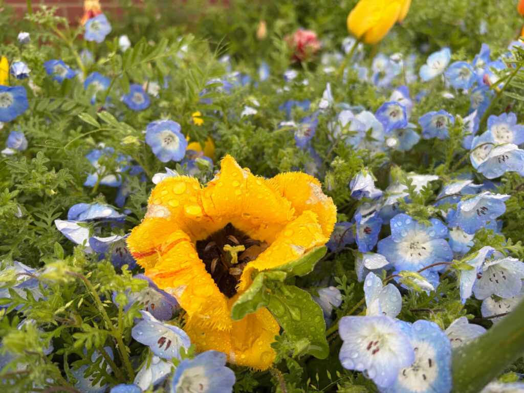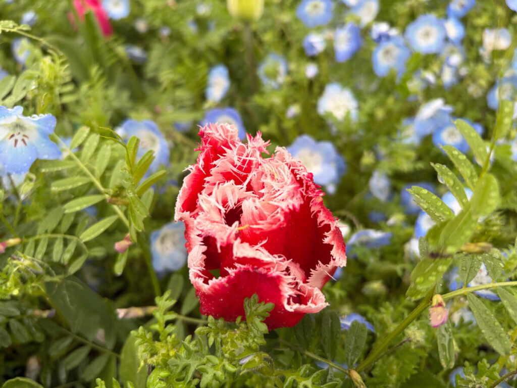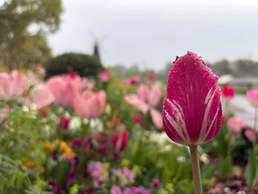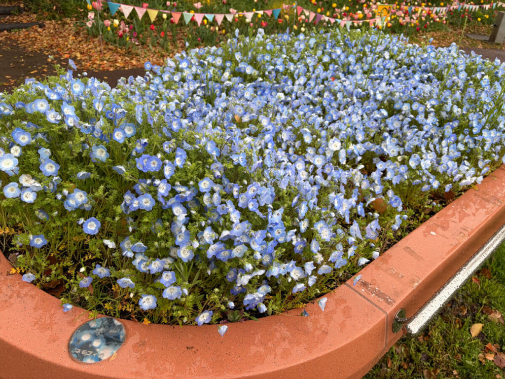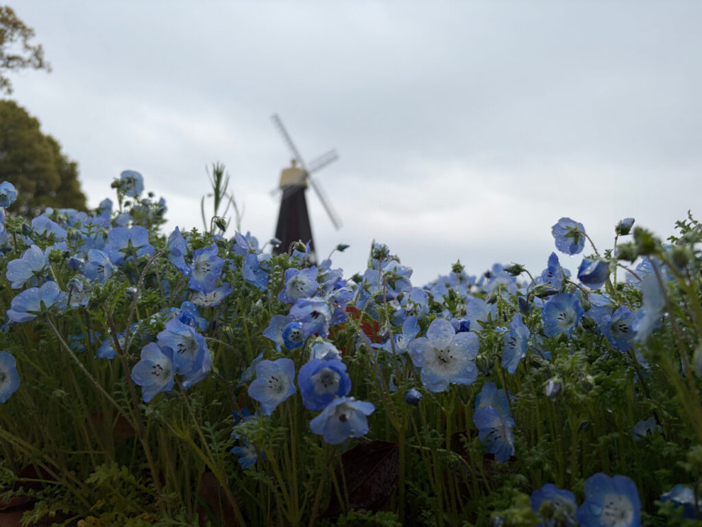 風車の下ではネモフィラとチューリップのコラボレーション開催中!