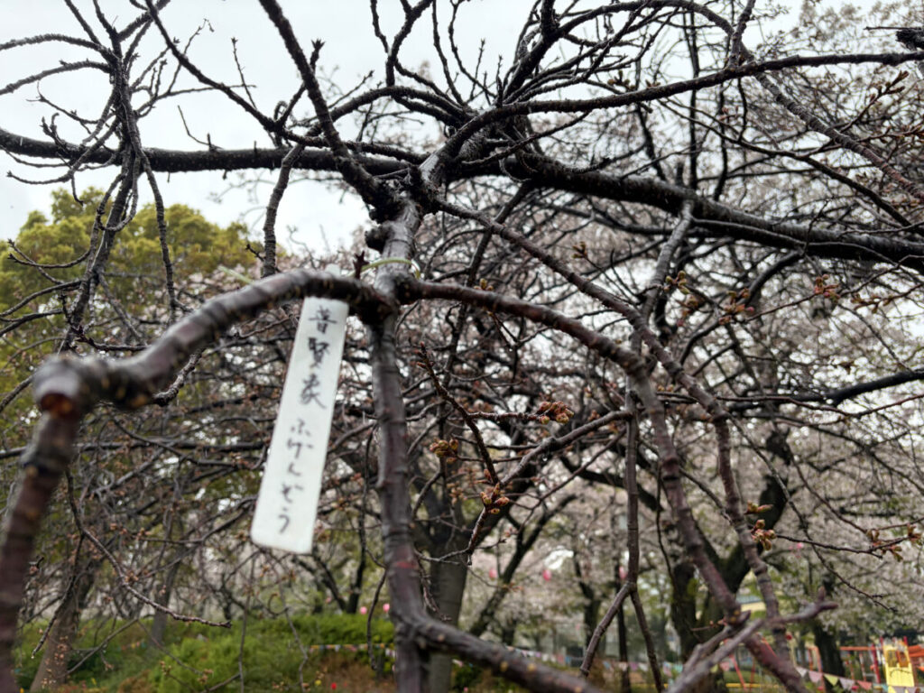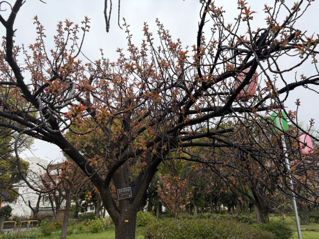 おや、「フゲンゾウ」という木がたくさん蕾をつけていました!桜かな?
