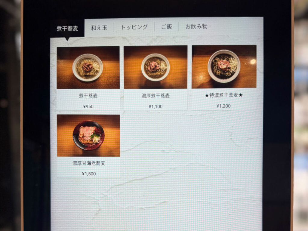 煮干・濃厚煮干・特製煮干の3種類に、期間限定麺の「濃厚甘海老蕎麦(※4月5日で終了)」もあるんだ〜!