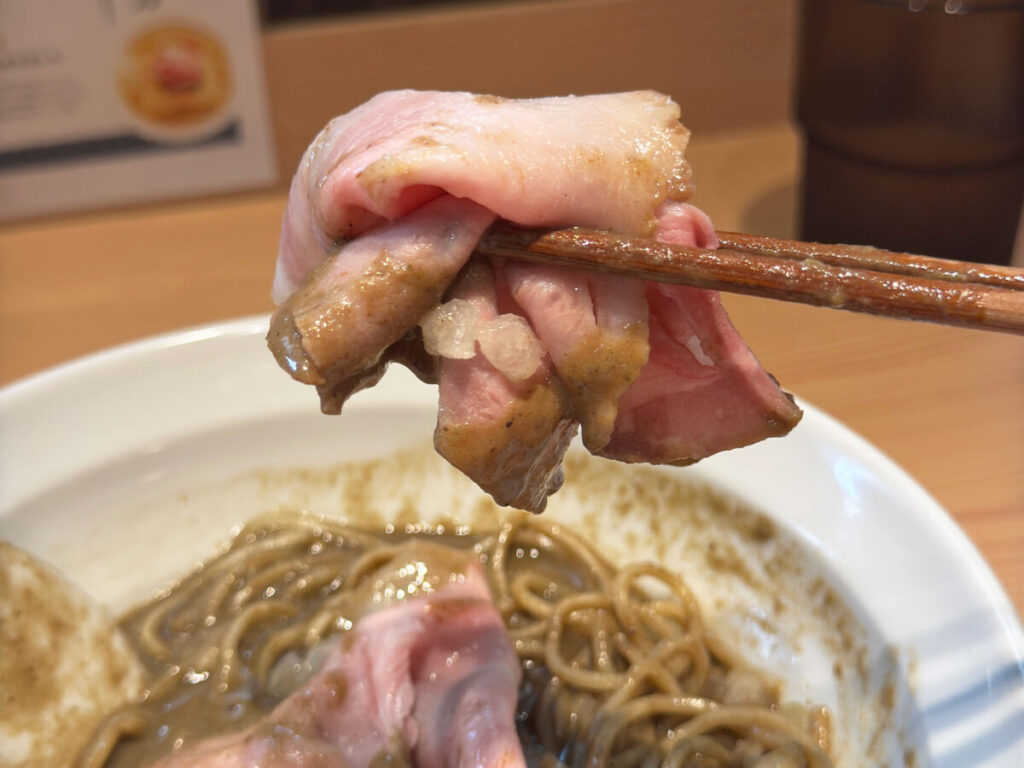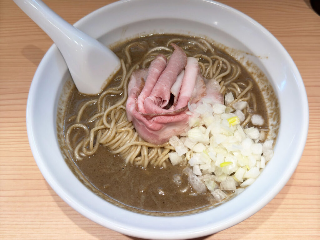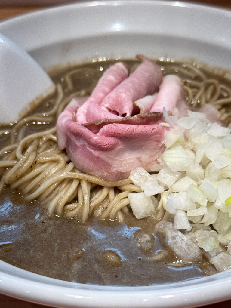 中心にはレアチャーシュー、脇には玉ねぎ。シンプルながら美しいビジュアル。