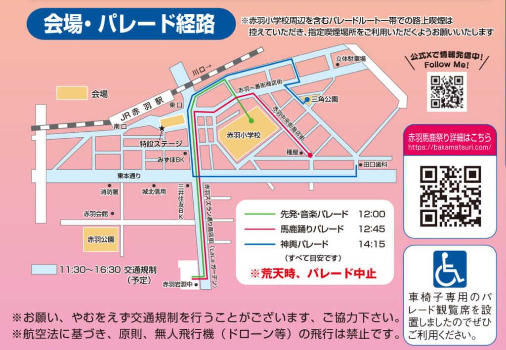 当日は赤羽駅周辺や商店街で交通規制が行われます。車での移動はもちろん、バスのルート変更などにも注意が必要です。