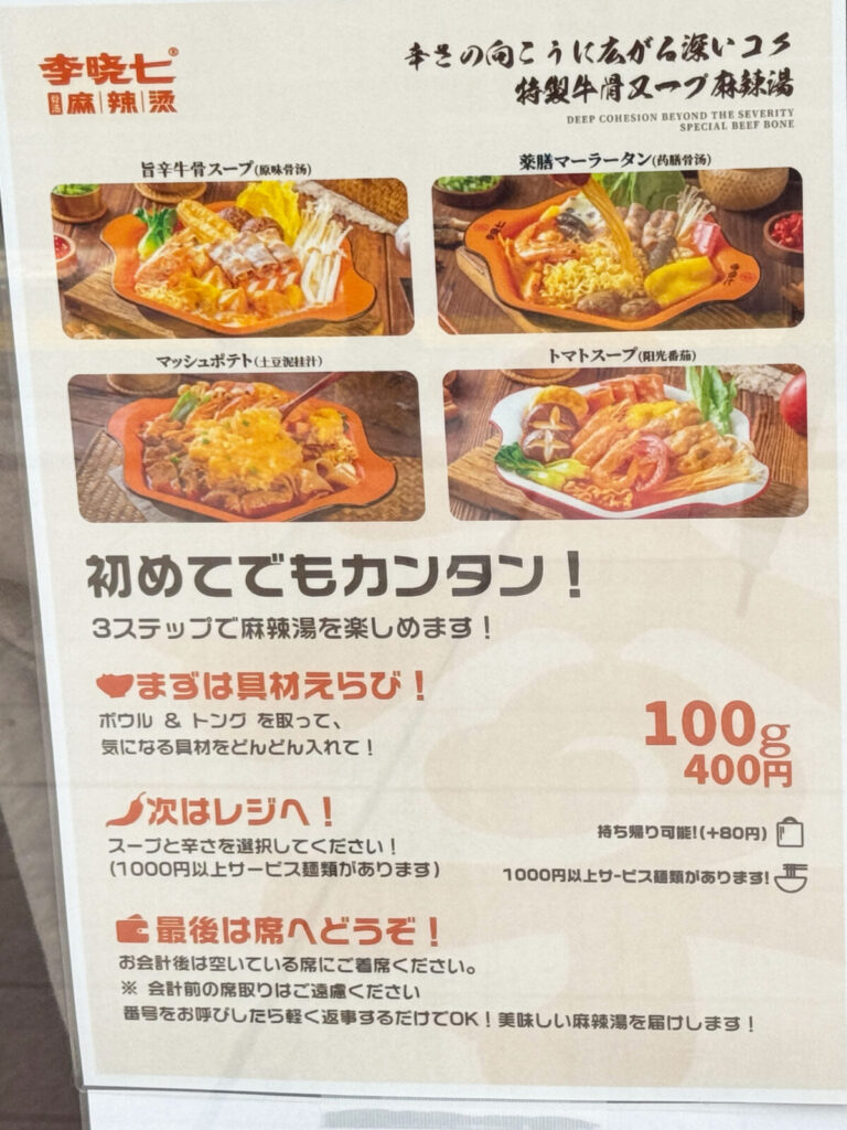 「李暁七マーラータン」は、好きな具材を自分で選び、4種類のスープから好みの味と辛さをチョイス。計量してお会計するスタイルです。