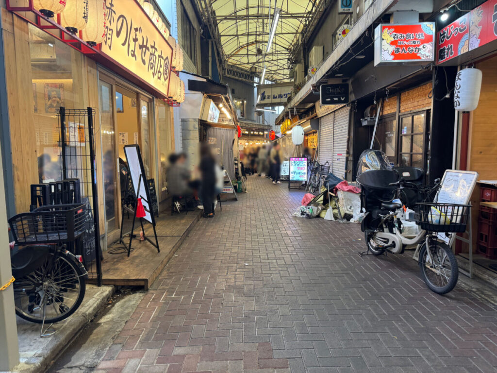 左は赤羽駅方面。すぐ隣に「のぼせ商店」や、「呑み食い処はじっこ離れ まんなか」があります。