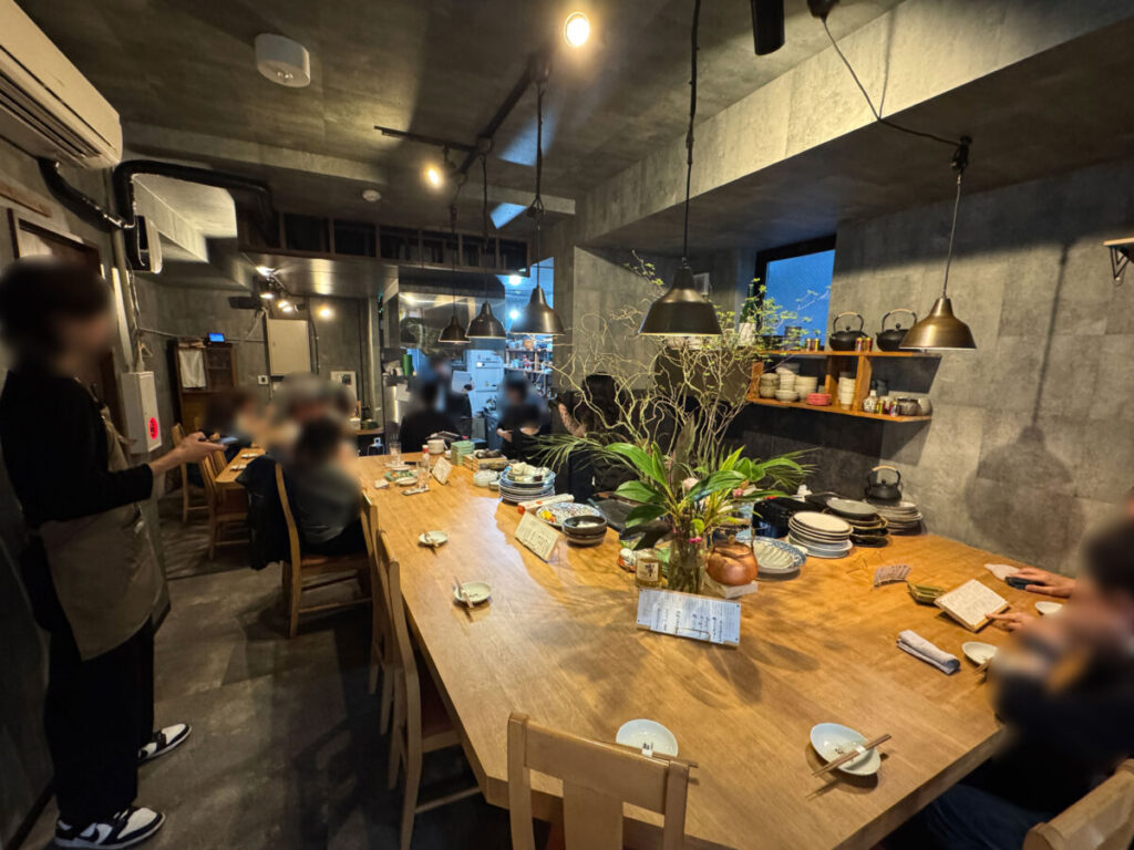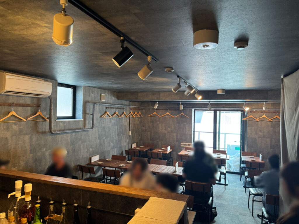 店内に入ってみると、コンクリート打ちっぱなしでクルーな内装。1階はカウンター席が14席。