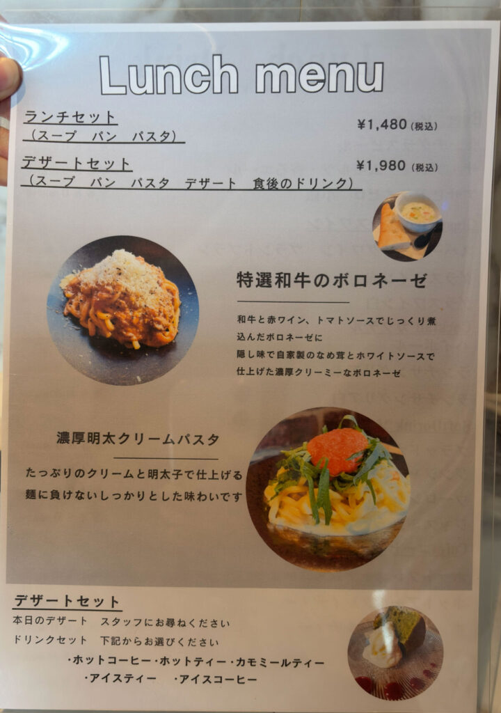 ランチメニューはこんな感じ。ピザやアラカルトの提供はなく、パスタのセットのみ。「特選ボロネーゼ」と「本日のパスタ」の二種類から選べますよ。