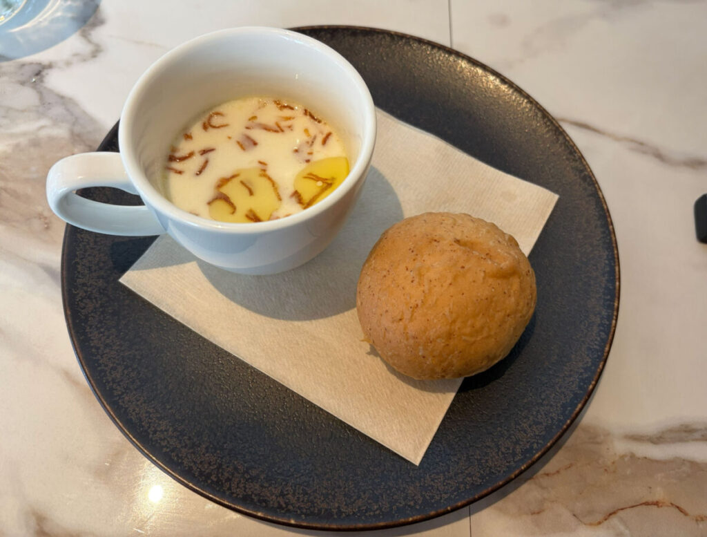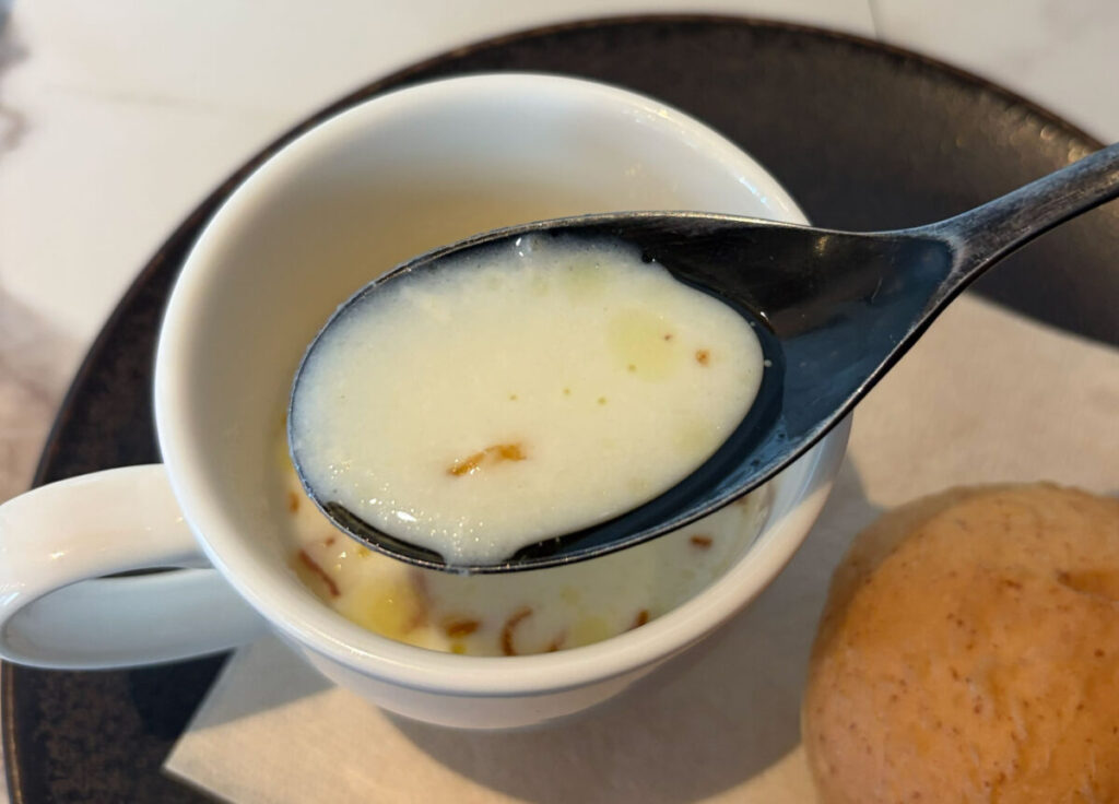 んん~♪ざらざらっとしたじゃがいもの舌触りを感じるポタージュだ~(⌒∇⌒)フライドオニオンは甘さをしっかりと感じて、アクセントになってますね~!