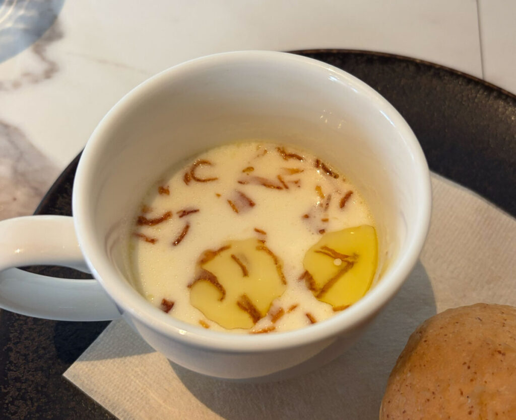 ジャガイモのポタージュ!オリーブオイルとフライドオニオンが入っています。