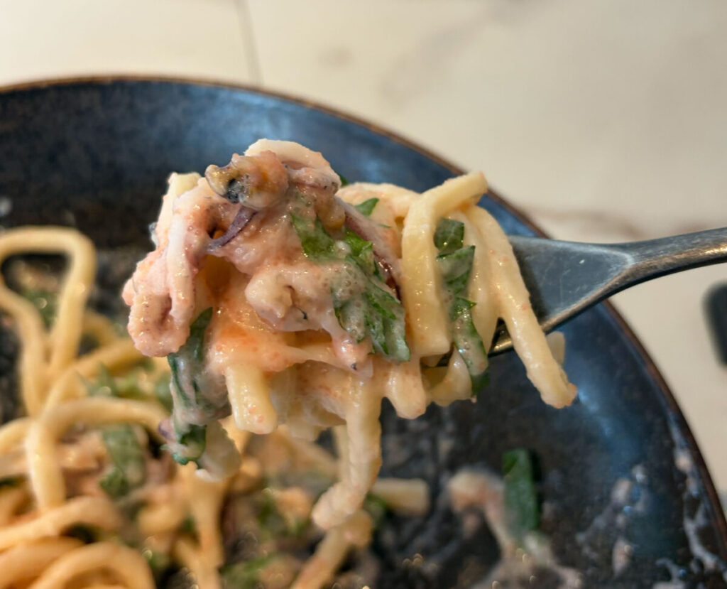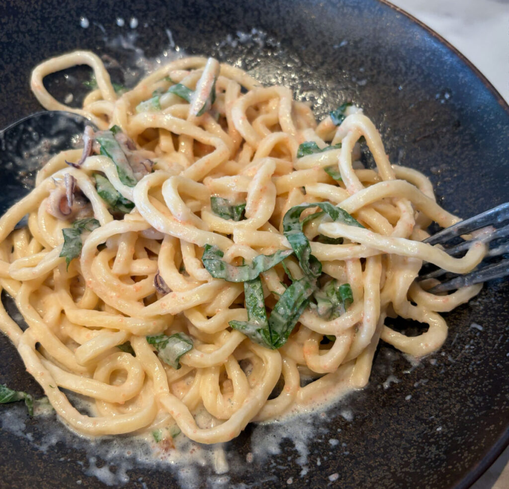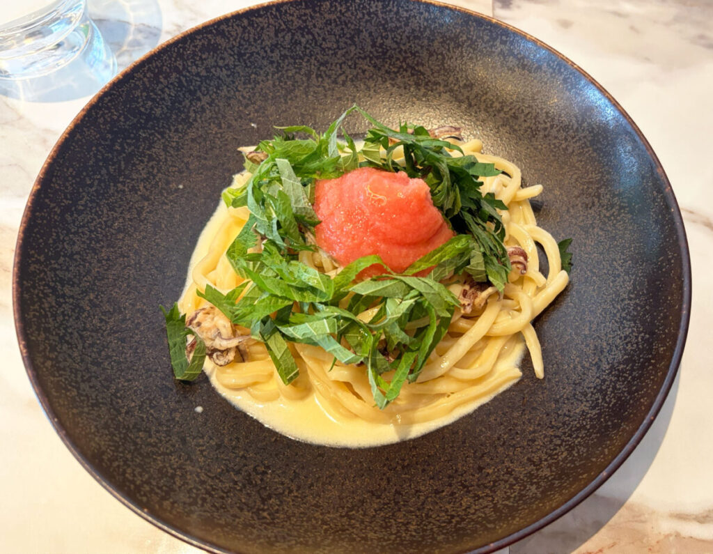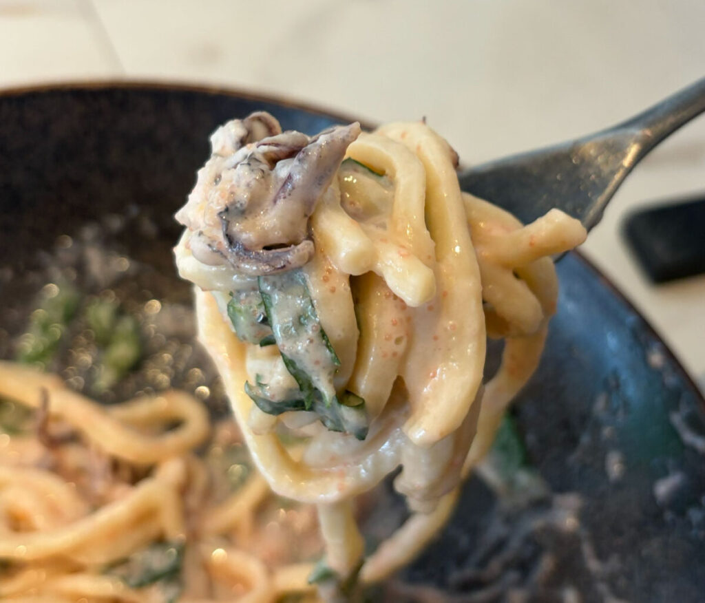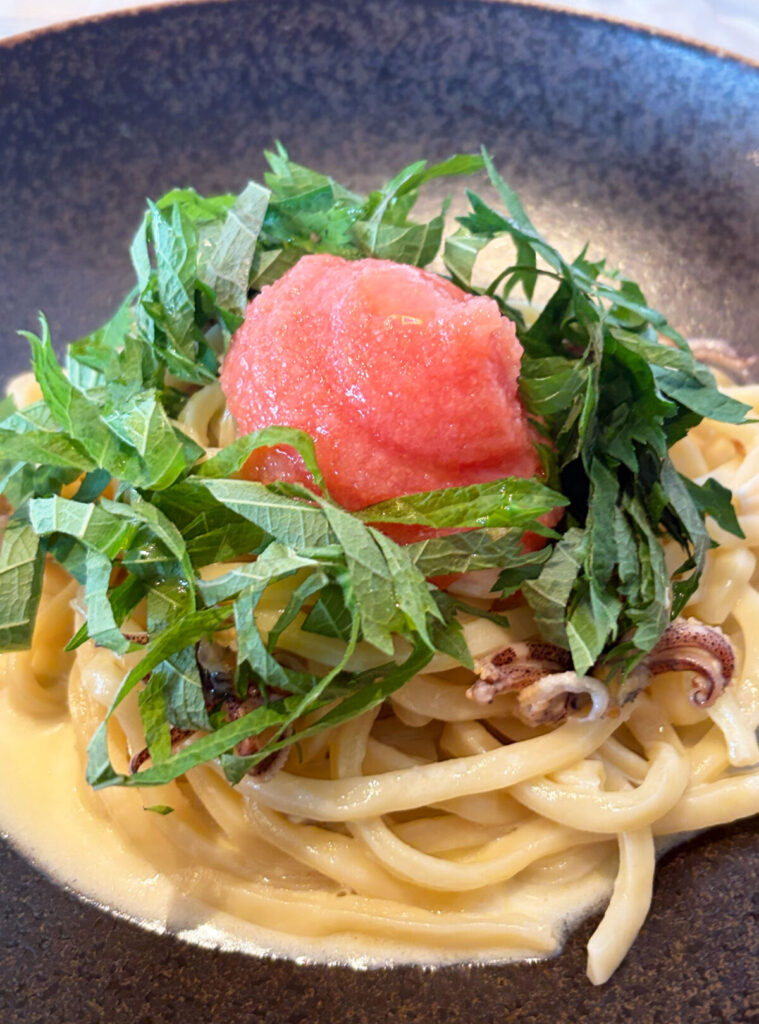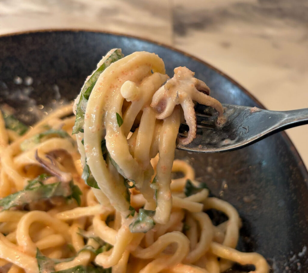 んん~~~(^▽^)/パスタ、もっっちもっちだ~!たらこのプチプチ感にゲソのコリコリ感も楽しいぞ~!
