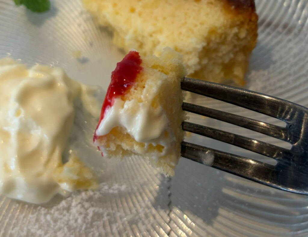 うんうん、フランボワーズソースの程よい酸味とクリームの甘さが良いですね~♪ドリンクとの相性もばっちり!