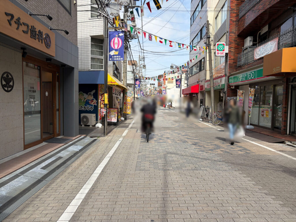 左です。こちらに進むと、「マチコ歯科」や「天ぷら 川源」があります。