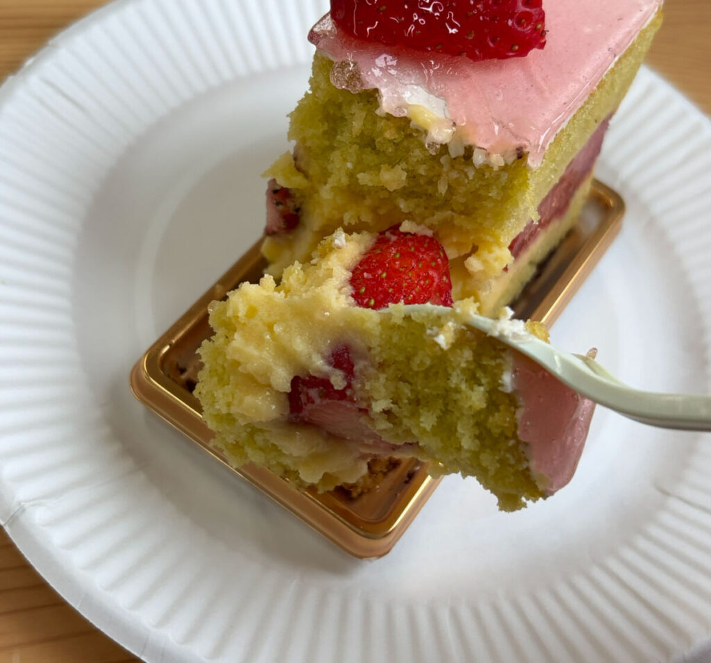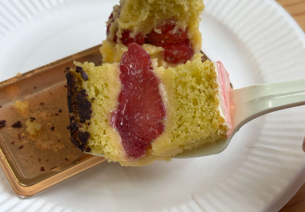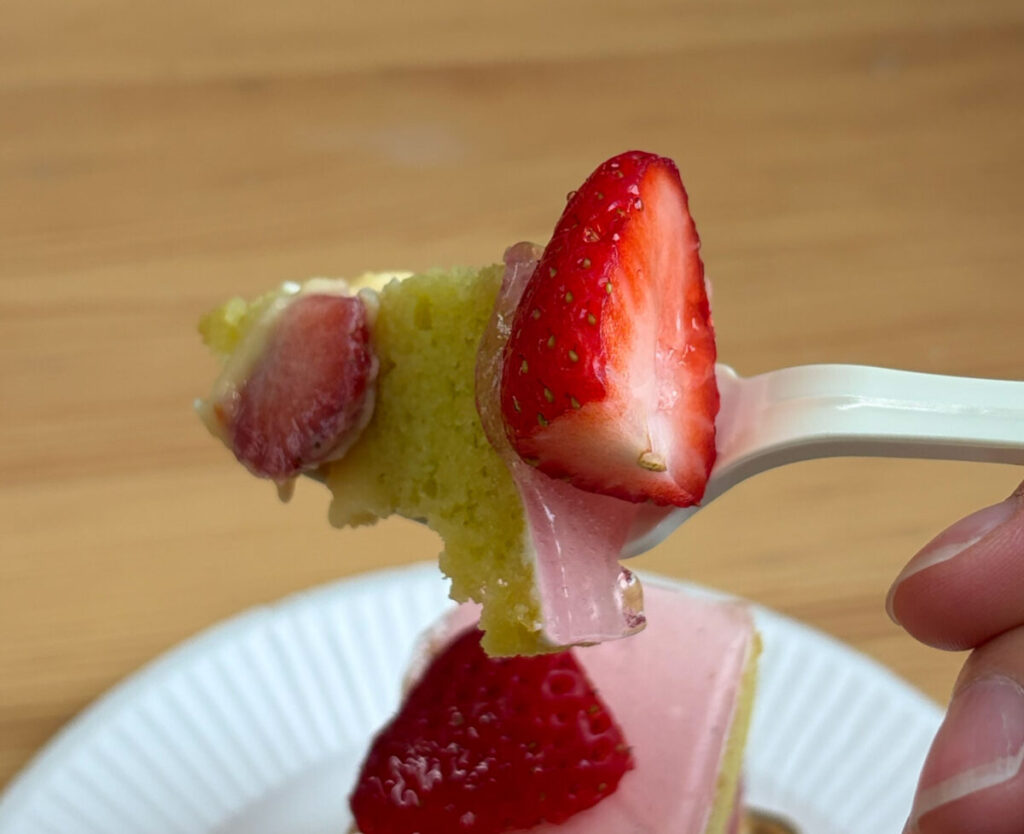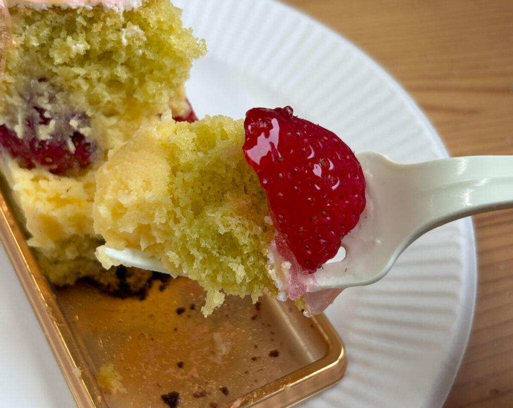 んん~♪しっとりとしたスポンジはシロップの甘さを感じますね~!苺のやわらかい酸味によってパクパク食べれちゃいます!