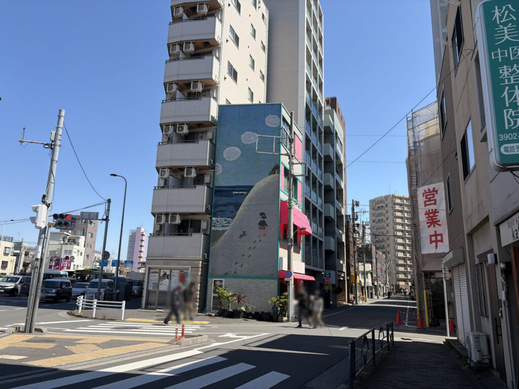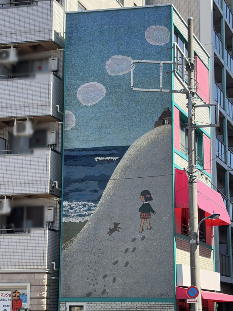 赤羽岩淵駅を出てすぐのところにあり、環八と北本通り、そして旧岩槻街道が交差する大きな交差点に面しているビルの壁画。