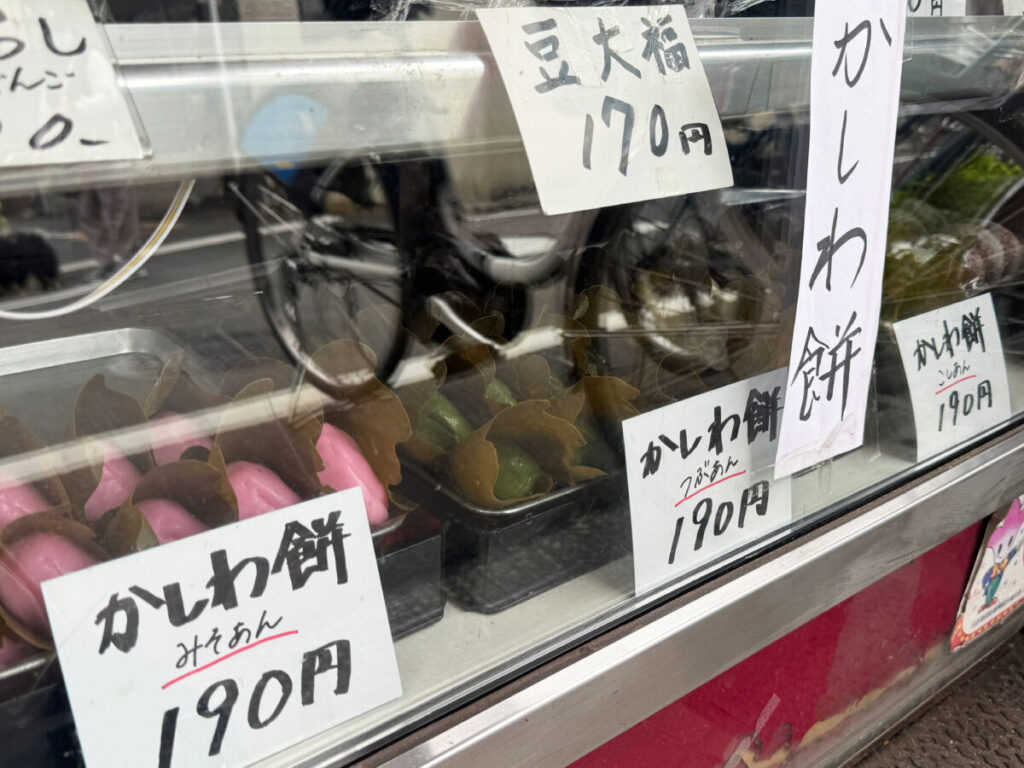 かしわ餅は、みそあん・つぶあん・こしあんと並んでいましたよ!