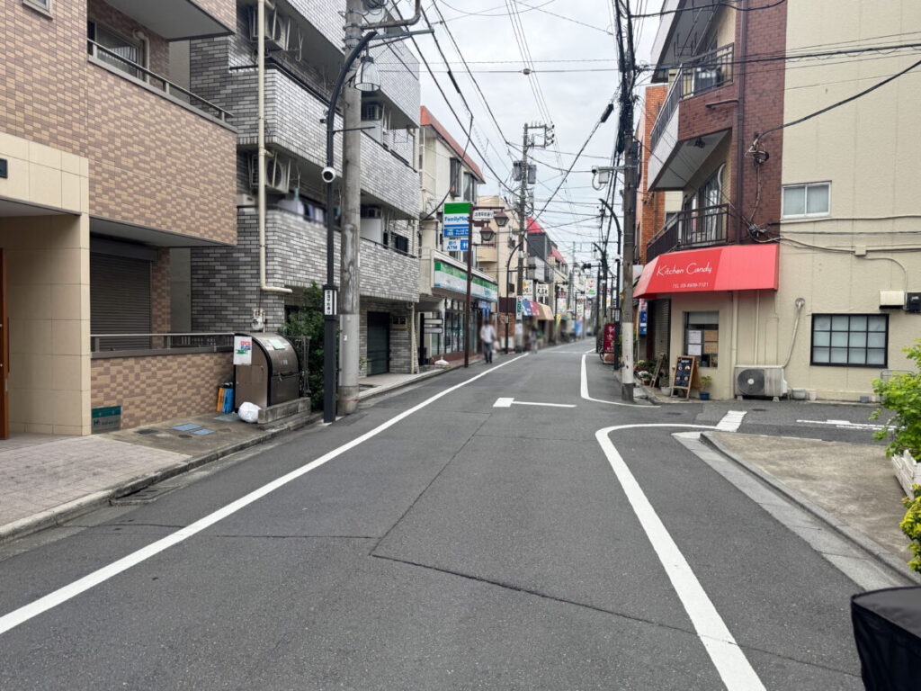 お店を背にして右はこちら。こっち行くとすぐに「Kitchen Candy」や「ファミリーマート」があり、その先に「クレープハウス シルベーヌ」などがあります。