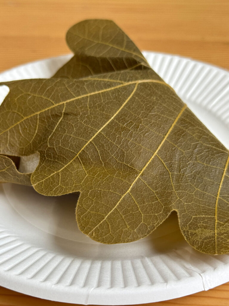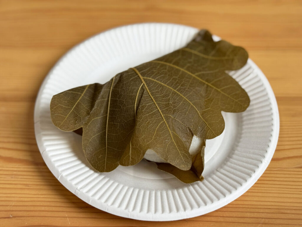 かしわの葉っぱをぺらっと。ふわっと広がるいい香りだ〜!その中には、まんまるのおもち!