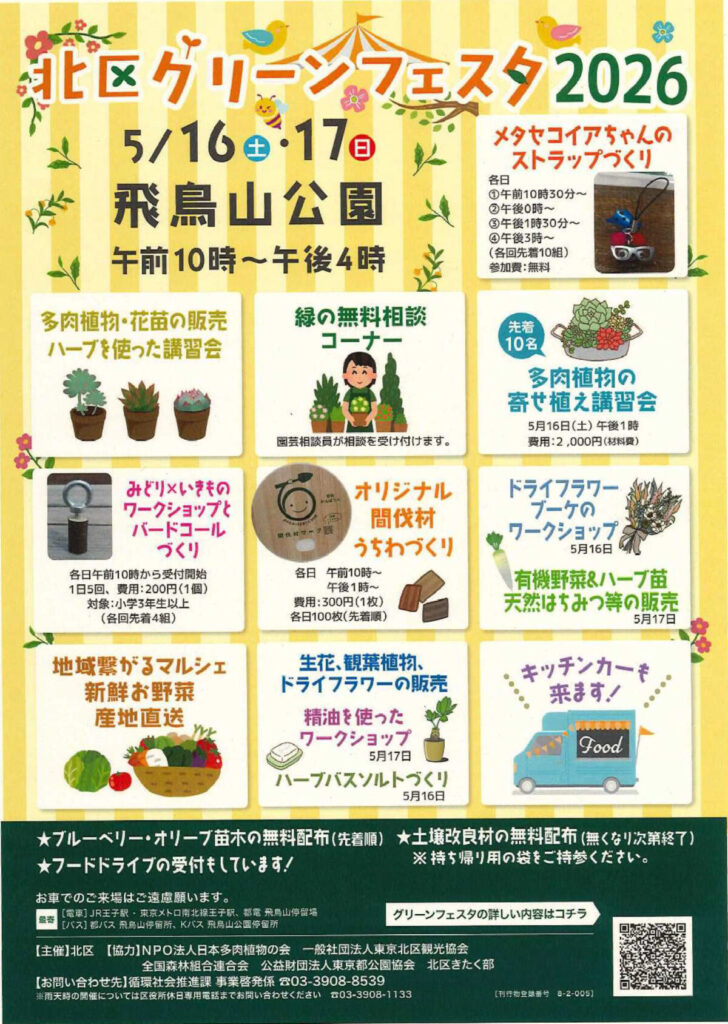 毎年開催されている「北区グリーンフェスタ2026」が、今年は5月16日・17日に飛鳥山公園で開催されます。