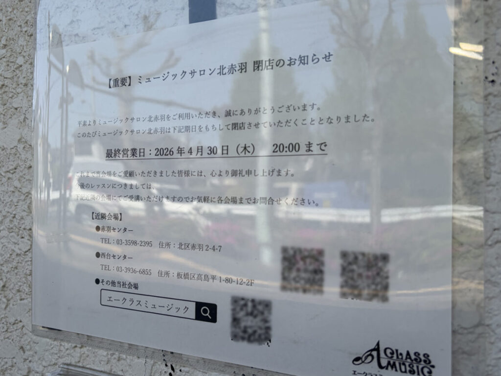 赤羽北2丁目団地にあるヤマハ音楽教室「エークラスミュージックサロン」が、4月30日をもって閉店するみたい。