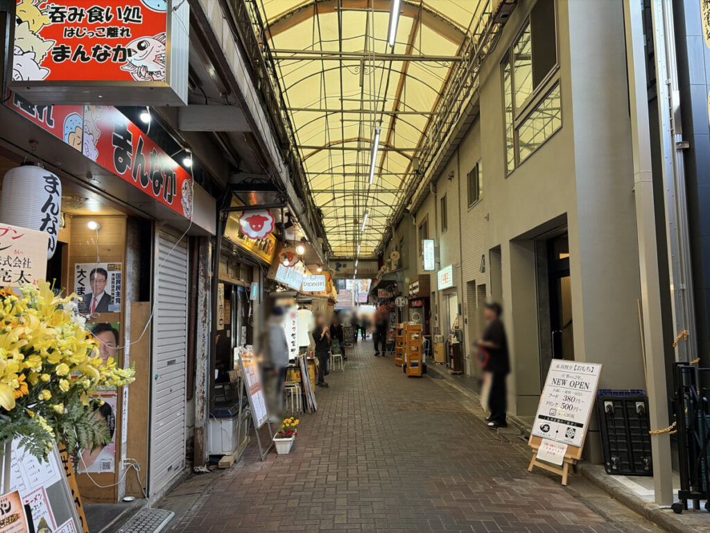 左です。斜向かいには先日新オープンした「赤羽割烹 おもち」があり、さらに行くと「赤羽ジンギスカン」や「丸健水産」。