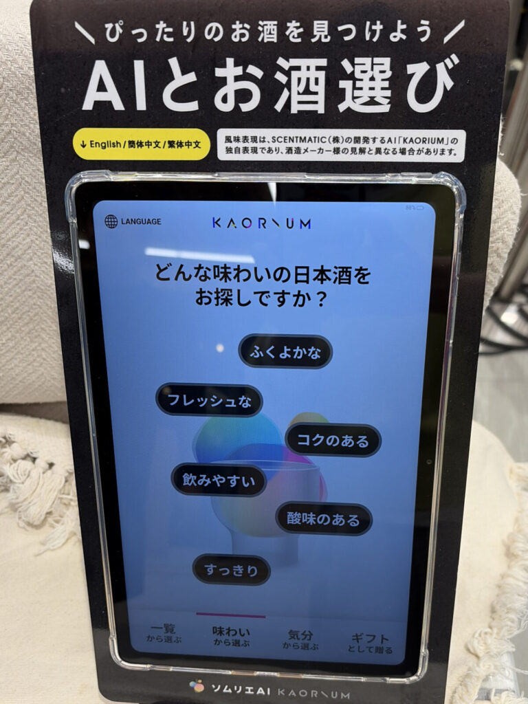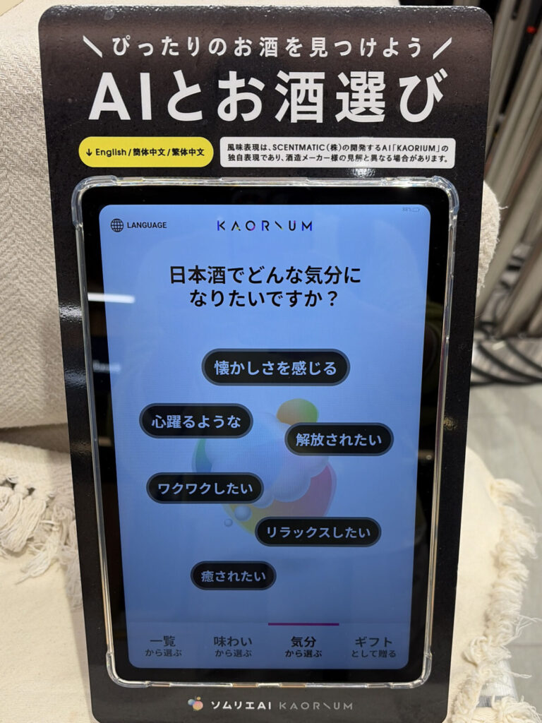 こちらは「ソムリエAI」といって、いまの気分や飲みたいお酒を選ぶとAIが店頭からおすすめのお酒を教えてくれるみたい(@_@)