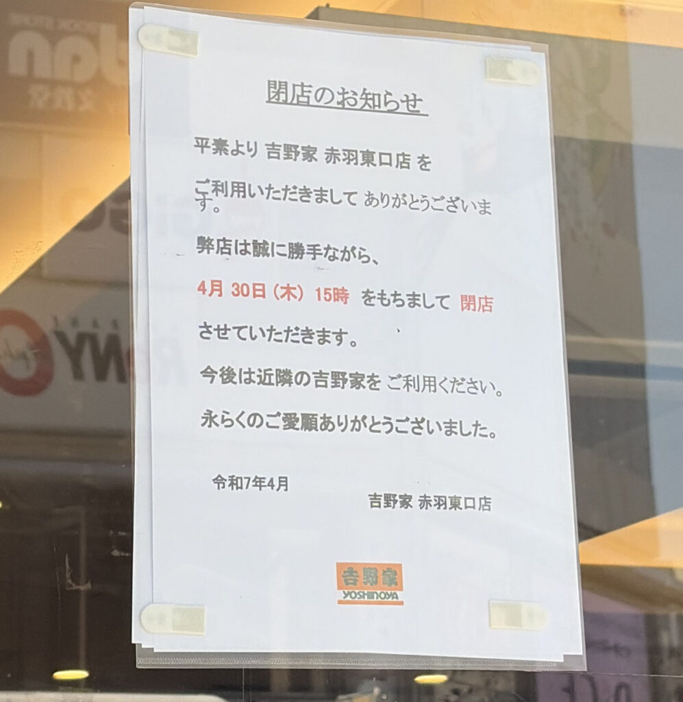 再開発のため閉店が相次ぐ赤羽駅東口ですが、ついに「吉野家」の店頭にも『閉店のお知らせ』が貼ってありました。