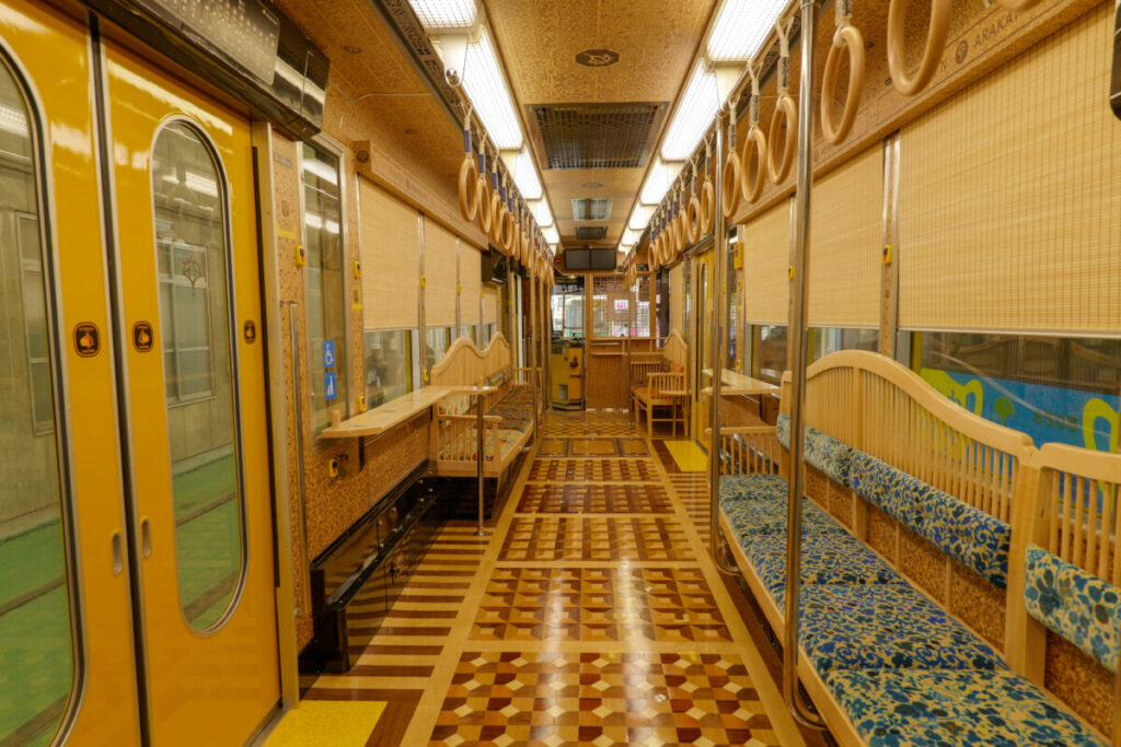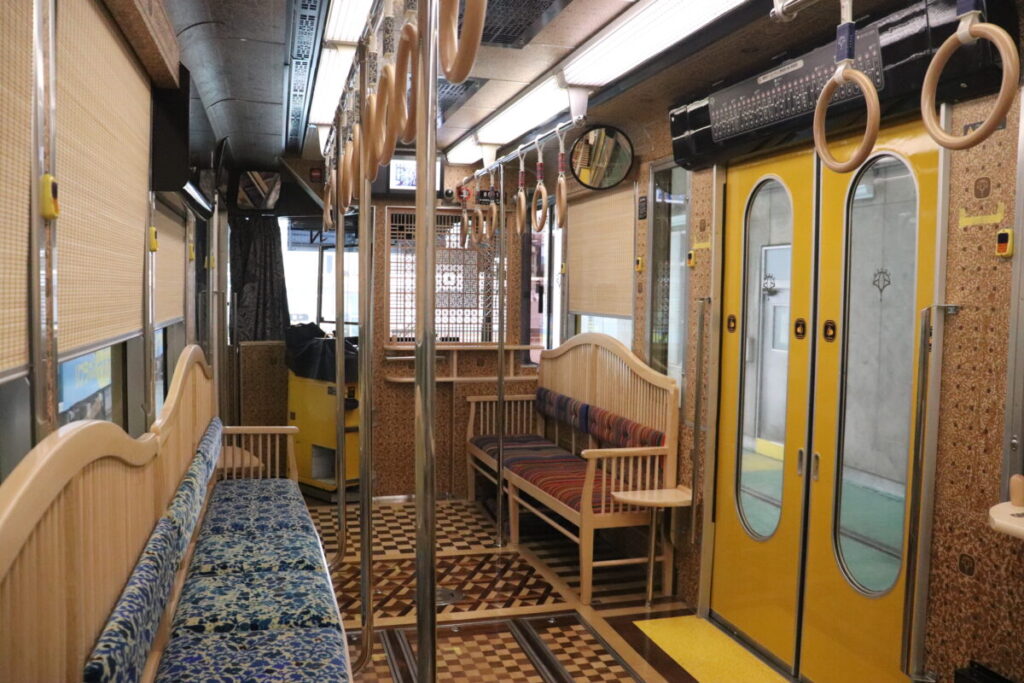 さらに車内は床・壁・天井・ベンチまで木製で、床は寄木、杉材の組子も使われているそうですよ。