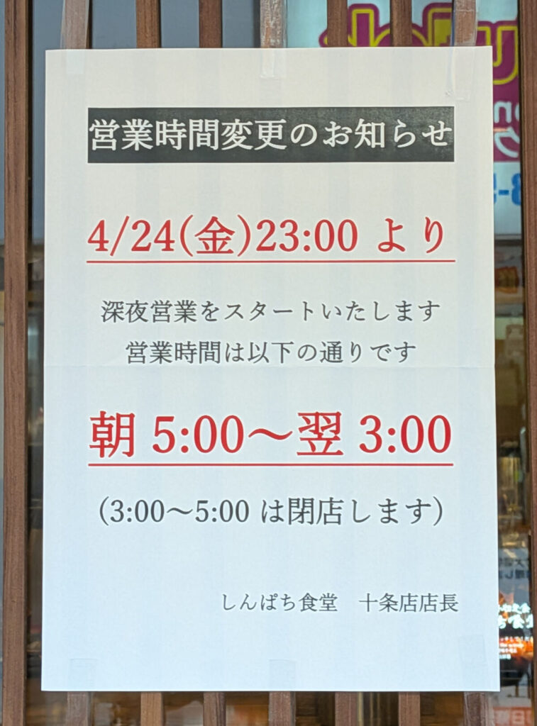 十条の「炭火干物定食 しんぱち食堂」が深夜営業を開始するみたい。