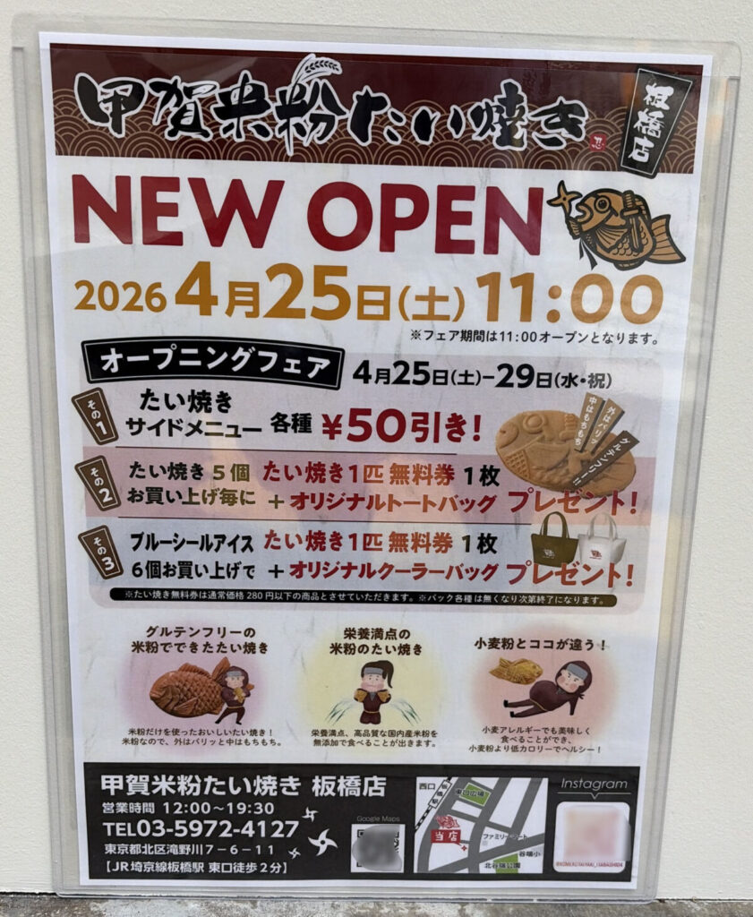 先日赤マガでもお伝えした、板橋駅東口にできる「甲賀米粉たい焼き」ですが、4月25日に新オープンするみたい!