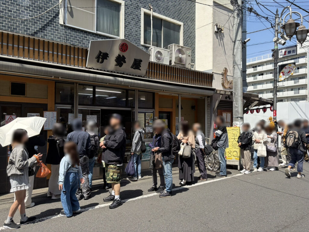 11時前の様子ですが、いつもと変わらず、いやいつもよりちょっと多く伊勢屋には大行列。