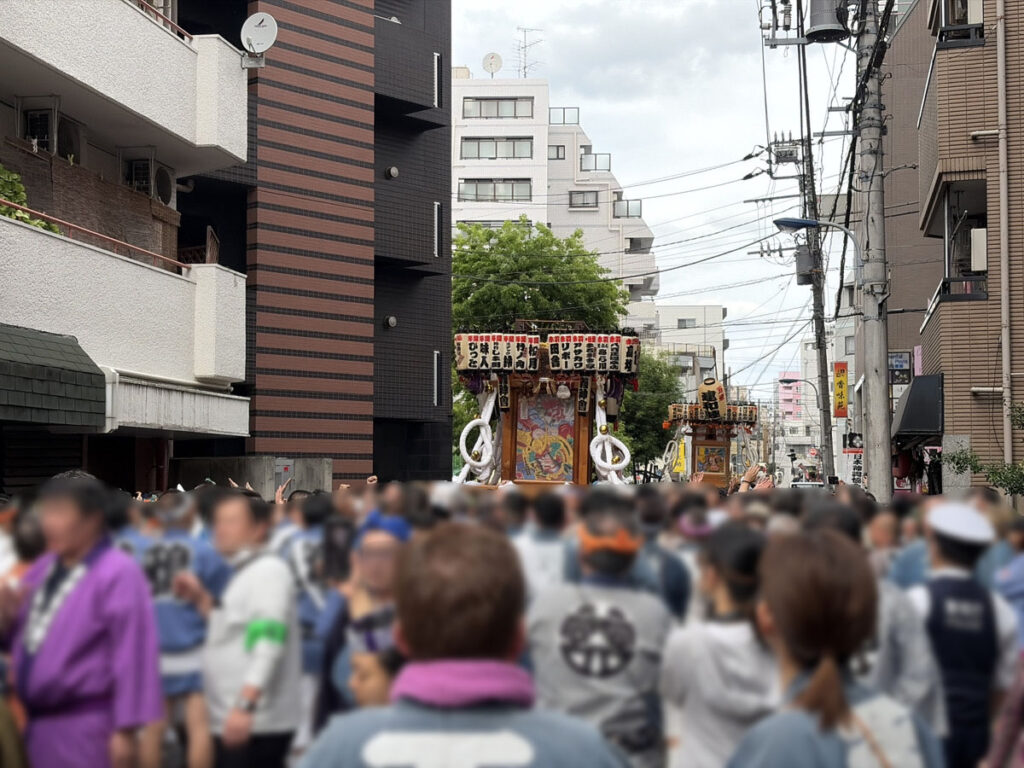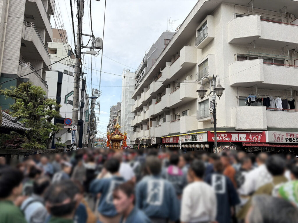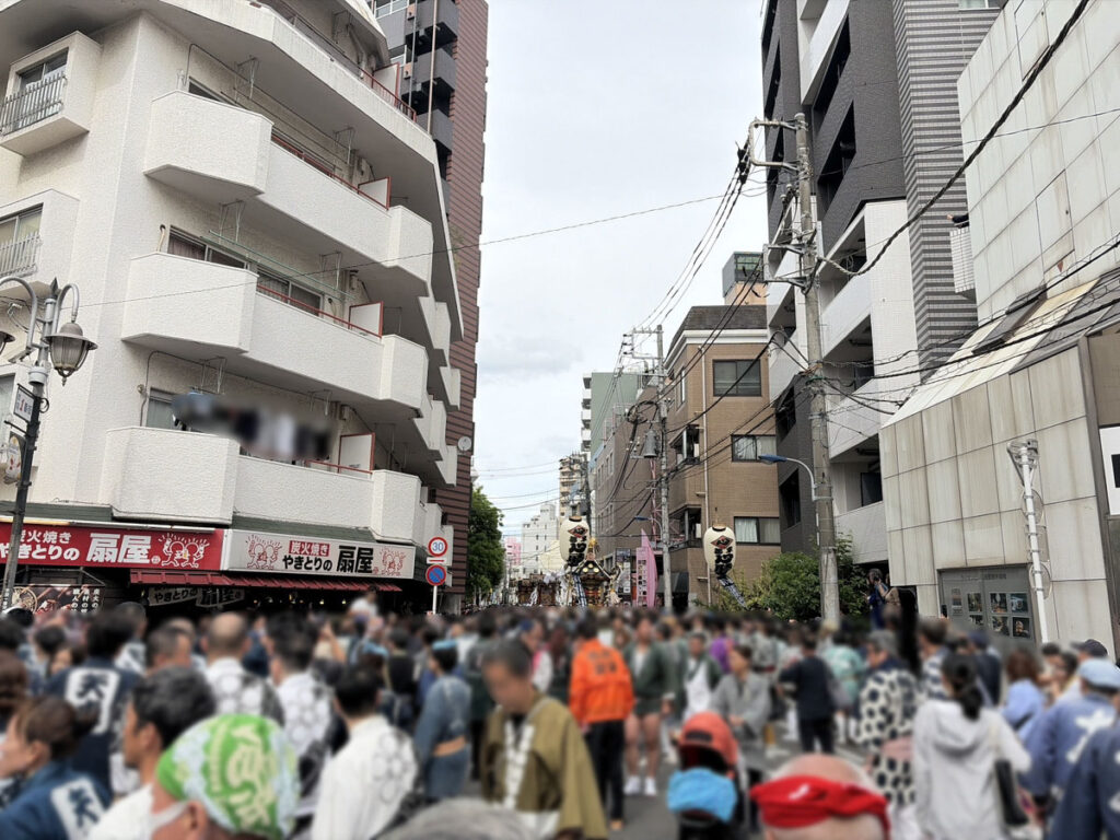 三角公園のほうからまだまだ熱い神輿の列が続きます。以上現場からでした!