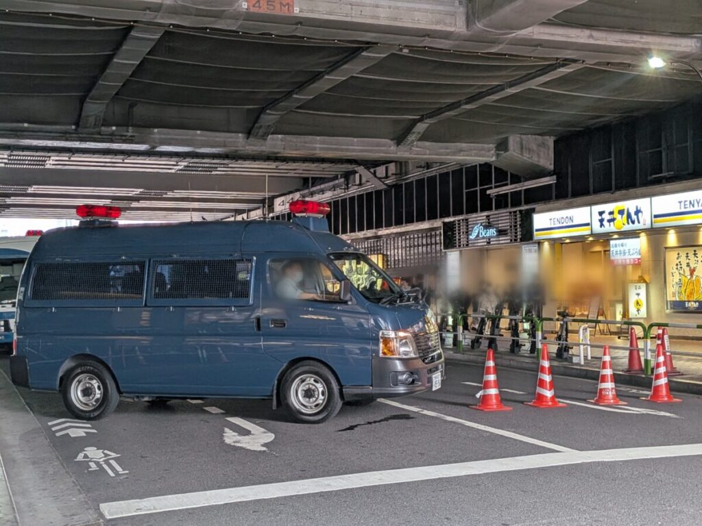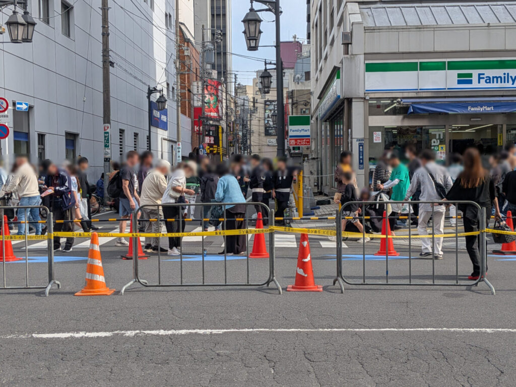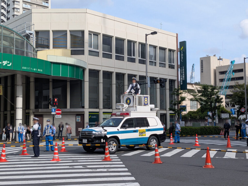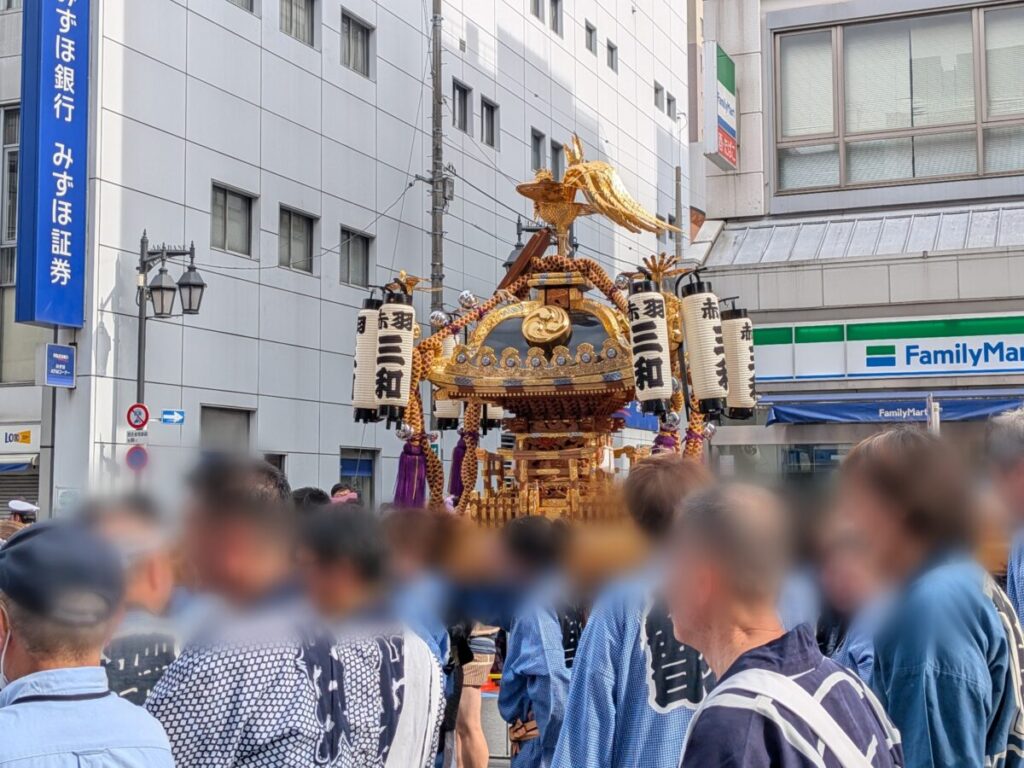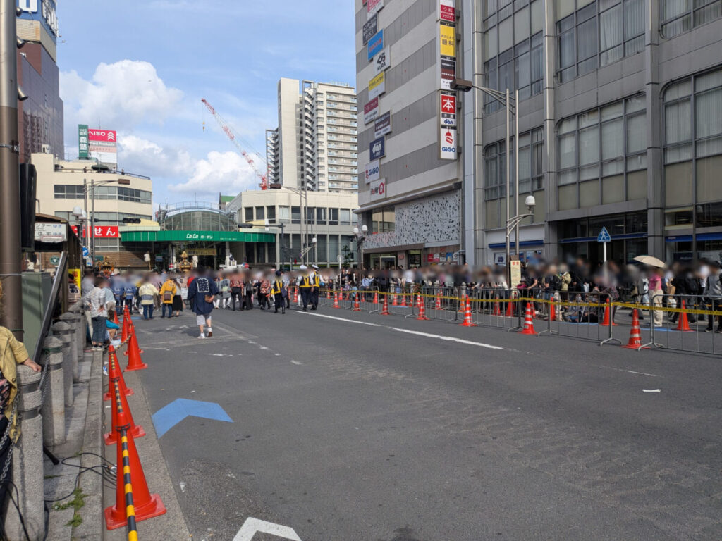 まずは、神輿パレードの終了間際。赤羽駅前では警察のバリケードも設置されてました。