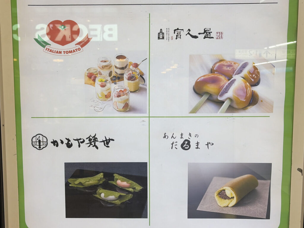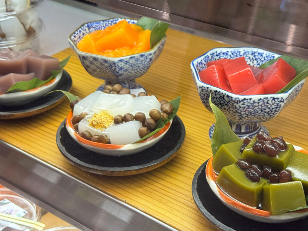 「フルーツあんみつ」など、ここに載りきらないほどの色んな和菓子が並んでいて、どれにするか迷っちゃうな〜!