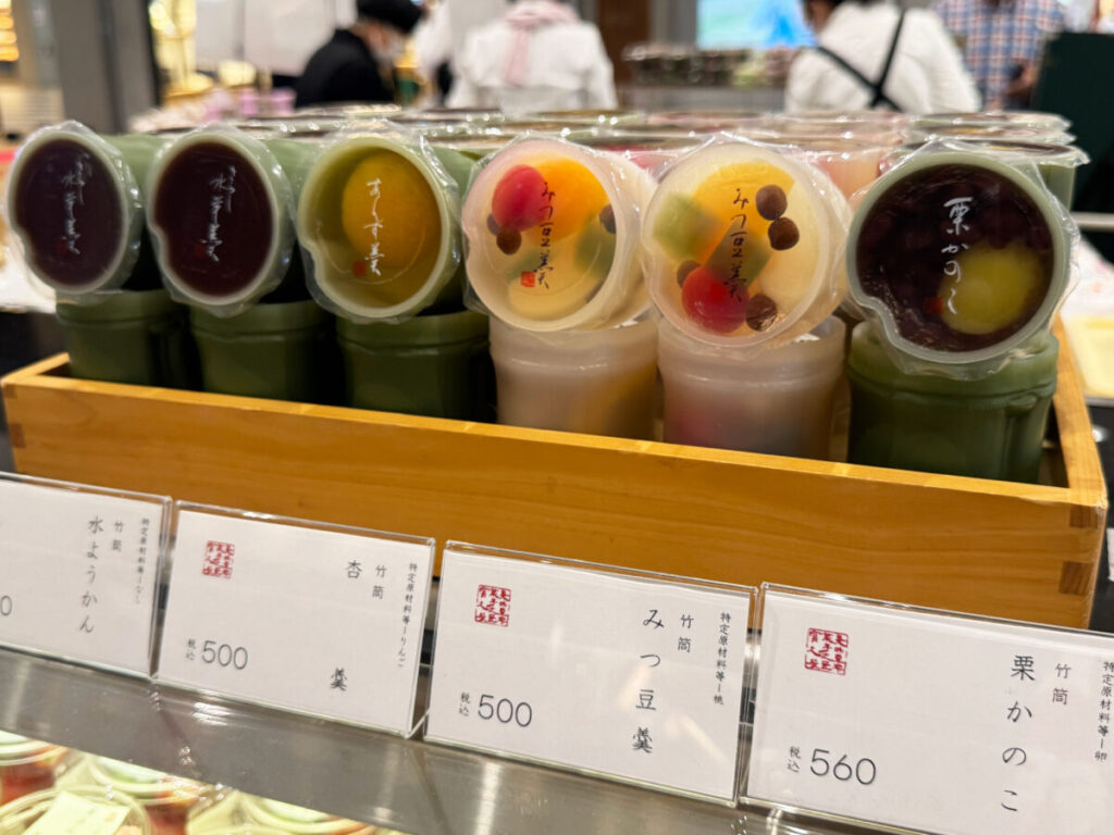 竹筒をモチーフにしたカップに入っているみつ豆や、水羊羹も手土産にいいな〜!