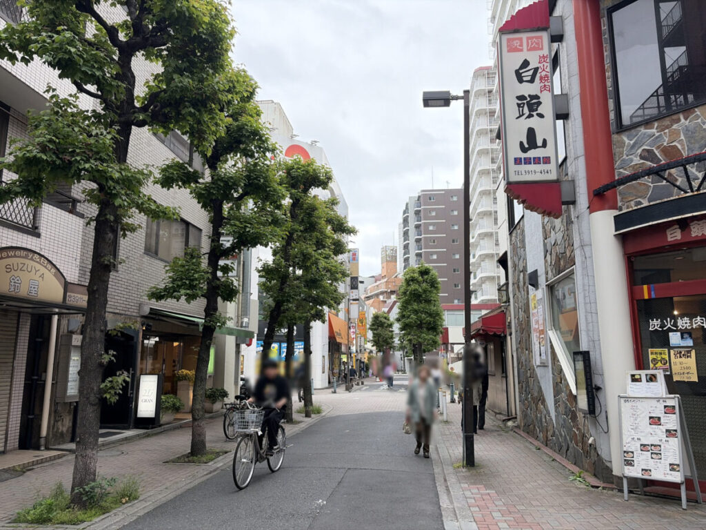 お店を背にして右はこんな感じ。隣は焼肉「白頭山」で、さらに行くと「中国料理 杏花村」などがあるビル。