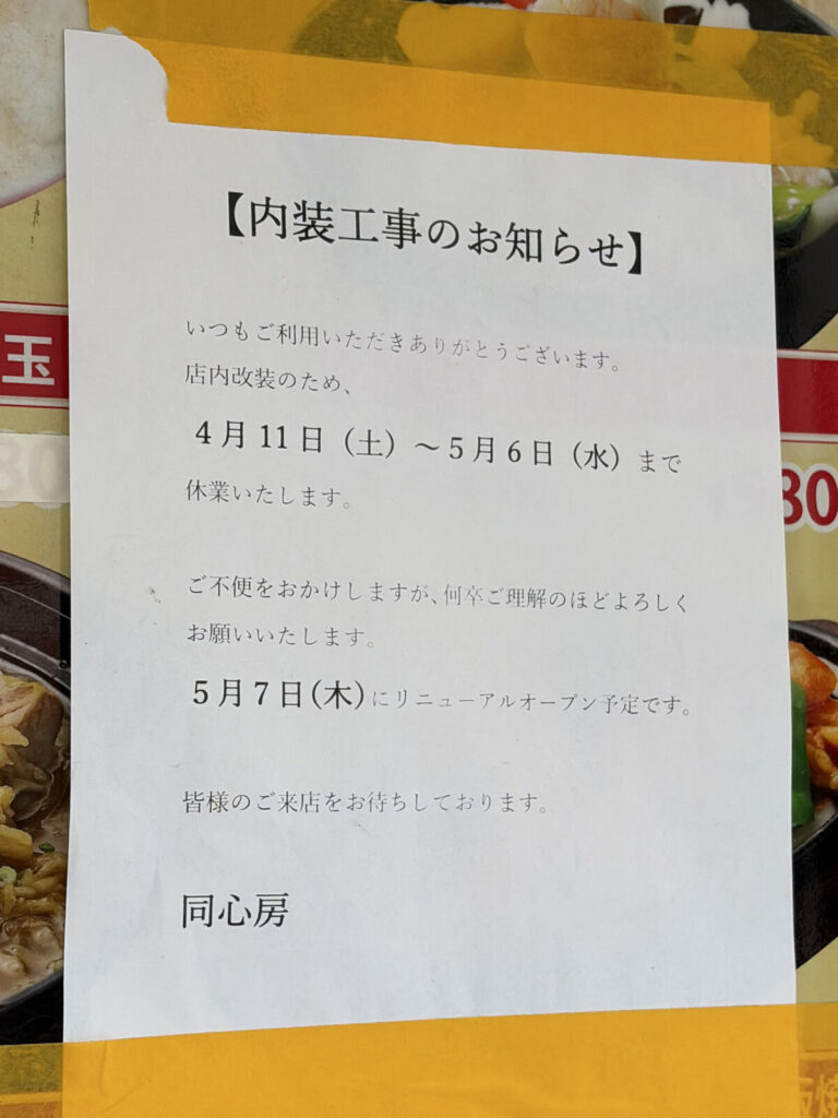 板橋駅東口を出てすぐのところにある「中国家常菜 同心房」が、改装工事のため一時休業中。5月7日にリニューアルオープンするみたい!