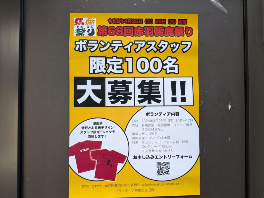 赤羽馬鹿祭りのボランティア募集してる。清野とおるデザインのスタッフ限定Tシャツが支給されって!!!