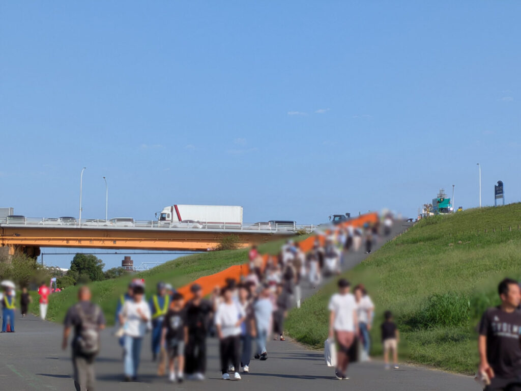 北区花火会、無料席側の14時頃の様子。斜面部分の場所取りはじまってる。